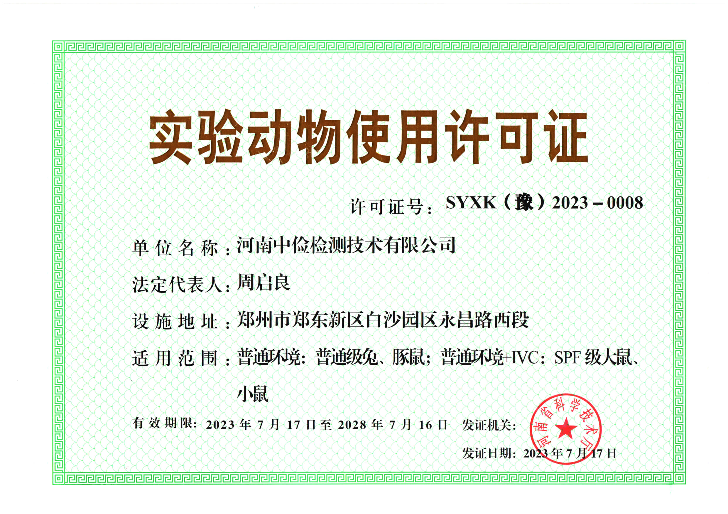 - 喜報!河南中儉檢測取得新的實驗動物使用許可證!
